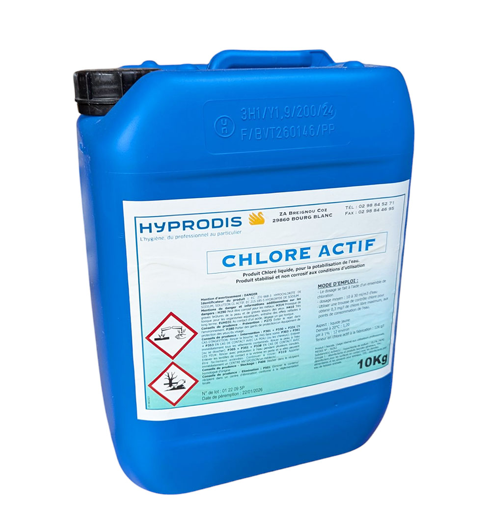 Quelles sont les conditions de stockage idéales ? Conservez le bidon dans son emballage d'origine, à l'abri de la lumière et à une température inférieure à 30°C pour préserver sa teneur en chlore actif.