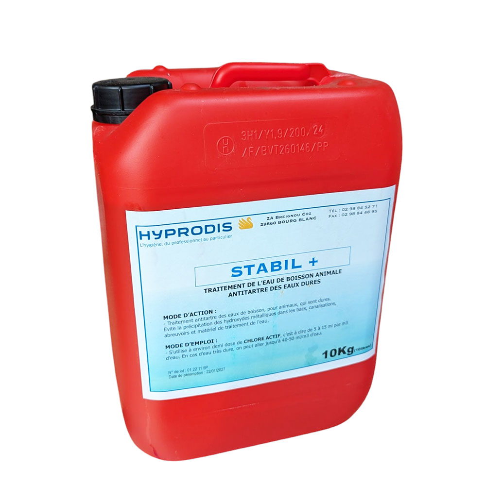 STABIL + est un agent d'amélioration de la chloration conçu pour traiter l'eau de boisson animale, particulièrement les eaux dures. Ce complexe séquestrant anticalcaire et stabilisant renforce l'efficacité des solutions chlorées tout en agissant comme un inhibiteur de corrosion pour protéger vos canalisations et votre matériel d'abreuvement.