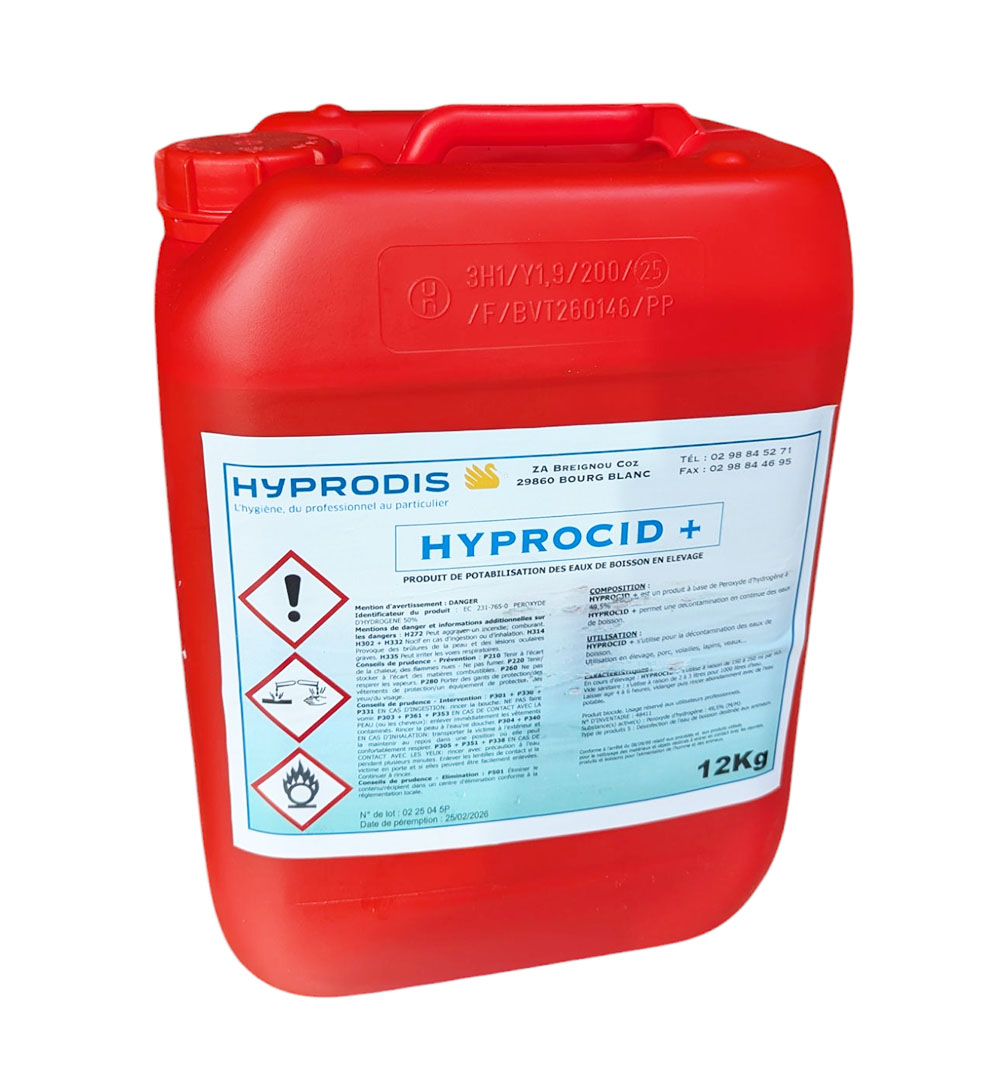 HYPROCID+ est un produit de potabilisation des eaux de boisson en élevage à base de péroxyde d'hydrogène stabilisé à 50%. Véritable innovation dans le traitement de l'eau, il assure une triple action : décontaminant, acidifiant et nettoyant. Il permet de garantir une parfaite bactériologie de l'eau consommée par les animaux tout en entretenant les canalisations.