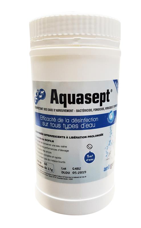 Aquasept® est un désinfectant sous forme de comprimés effervescents à libération prolongée, conçu pour la purification totale de l'eau. Doté d'un spectre d'action complet (bactéricide, fongicide, virucide et sporicide), il assure une efficacité de désinfection sur tous types d'eau. Hautement sécurisé, ce produit est homologué pour le traitement de l'eau de boisson humaine.