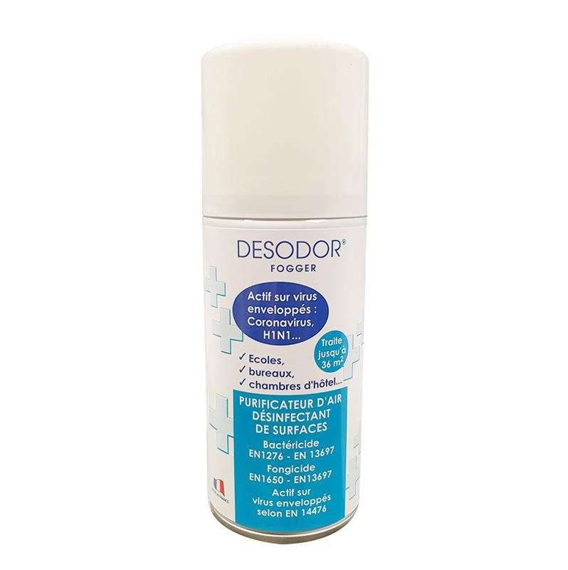 Le Désodor FOGGER 150ml est un purificateur d'air et un désinfectant de surfaces à percussion unique ("one-shot"). Cet aérosol percutant unidose est spécialement conçu pour assainir l'air ambiant et toutes les surfaces lavables en une seule application. Efficace contre les virus enveloppés tels que le Coronavirus et le H1N1, il laisse une agréable sensation de fraîcheur grâce à son parfum mentholé.