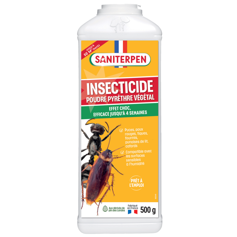 Saniterpen Insecticide poudre au pyrèthre végétal est très actif contre les puces, fourmis, mites, punaises, cafards, poux, tiques...