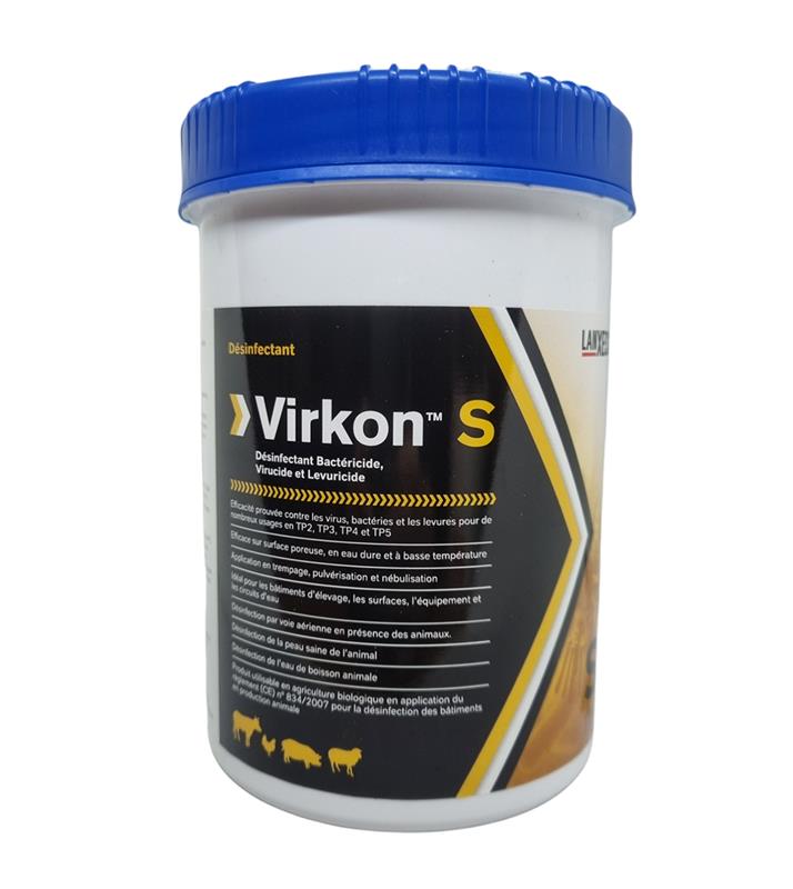 Le Virkon™ S est un désinfectant en poudre à large spectre reconnu mondialement pour son fort pouvoir oxydatif. Sa formule unique pénètre la membrane cellulaire des micro-organismes pour provoquer leur destruction complète en quelques secondes. Efficace contre les bactéries, les champignons, la teigne et les levures, il combat également 22 familles de virus. Biodégradable à 90%, il est homologué pour une utilisation en présence d'animaux.