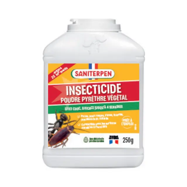 Saniterpen Insecticide poudre au pyrèthre végétal est très actif contre les puces, fourmis, mites, punaises, cafards, poux, tiques...