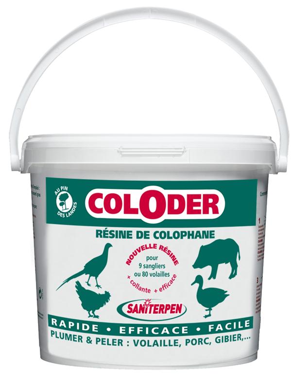 Coloder résine de solophane est un produit Saniterpen d'origine naturelle car issue du Pin des Landes, la résine de colophane Coloder facilite considérablement le plumage des gibiers à plumes et volailles (canards, oies, pintades, faisans,...) et le pelage des porcs et sangliers.