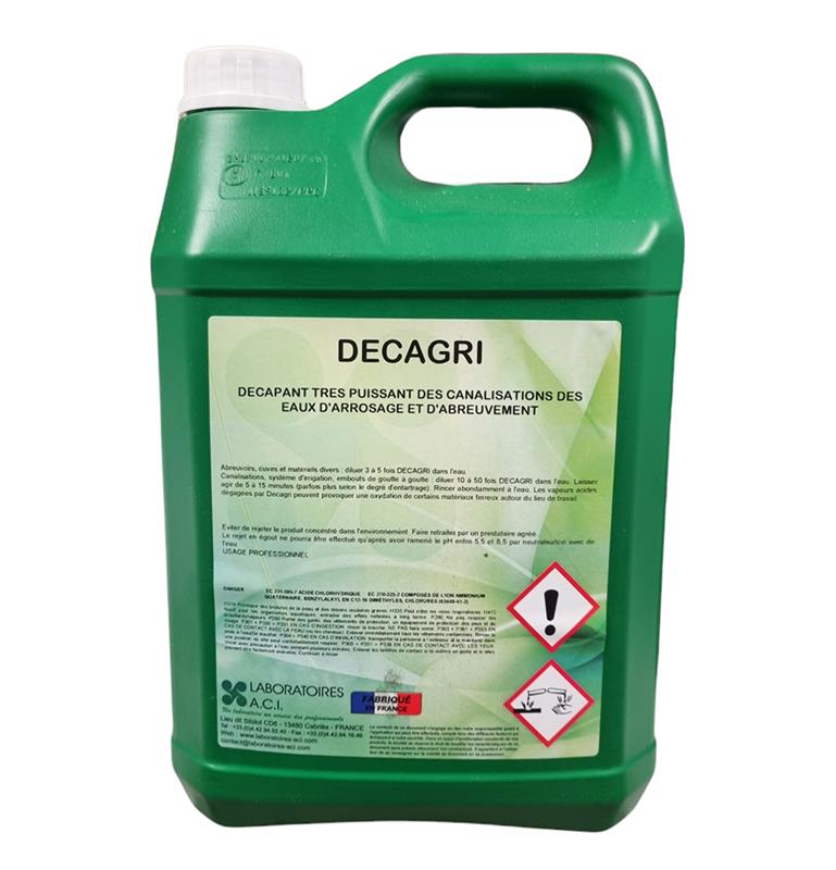 Le DECAGRI est un décapant et détartrant industriel de 5 Litres conçu pour le nettoyage intensif des canalisations d'eaux d'arrosage et d'abreuvement. Sa formule concentrée à base d'acide chlorhydrique élimine radicalement le calcaire, les algues et les matières organiques tout en préservant l'intégrité de vos supports métalliques et plastiques.