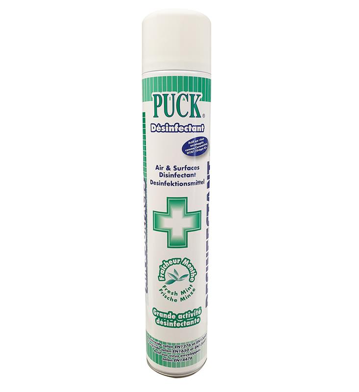 Le spray PUCK permet de réduire significativement la concentration atmosphérique des germes tout en désinfectant le matériel par application directe. Sa formule "Fraîcheur Menthe" assainit durablement votre environnement.