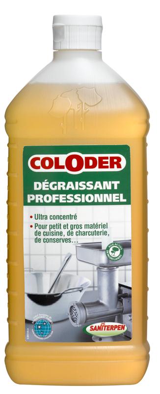 Coloder Dégraissant professionnel ulltra concentré dégraisse en profondeur il s'utilise pour nettoyer le matériel de cuisine : casseroles, sauteuses, friteuses, bassines, hachoirs, bols, mixers, louches et écumoires...Il supprime toutes traces de gras des sols, plans de travail... élimine en profondeur les graisses cuites.