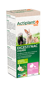 Assurez le bien-être digestif de votre petit compagnon avec Digesti'NAC Actiplant'. Ce complément alimentaire sous forme liquide est spécialement formulé pour les rongeurs, lapins et furets (dès 2 mois). Enrichi en extraits de plantes (Ail, Thym, Camomille), il aide à maintenir l'équilibre intestinal en cas d'inconfort passager.
