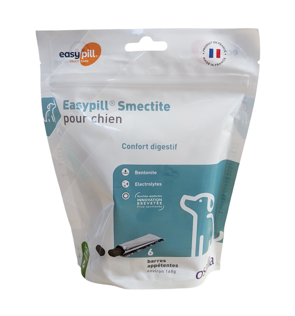 Easypill® Smectite est un aliment complémentaire pour chien spécialement formulé pour soutenir le confort digestif lors d'épisodes de déséquilibre intestinal. Grâce à sa richesse en bentonite (argile verte surfine) et en électrolytes, il aide à améliorer l'aspect des selles et à maintenir l'hydratation de l'organisme. Son format innovant en 6 barres sécables et son appétence exceptionnelle garantissent une prise spontanée par l'animal.