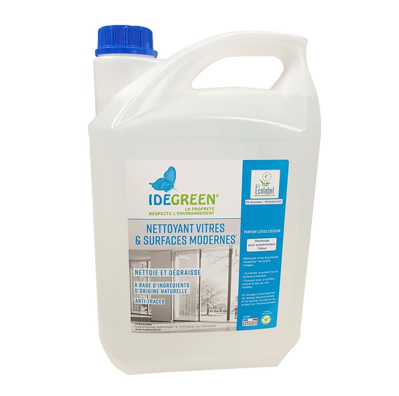 Le nettoyant IDEGREEN Vitres & Surfaces Modernes est une solution prête à l'emploi certifiée par l'Écolabel Européen. Formulé à base d'ingrédients d'origine végétale et minérale, il nettoie, dégraisse et fait briller les vitres, miroirs et surfaces techniques sans laisser de traces ni de voiles. Son parfum Lotus Cocoon apporte une note de fraîcheur délicate tout en garantissant une sécurité maximale pour l'utilisateur et l'environnement.