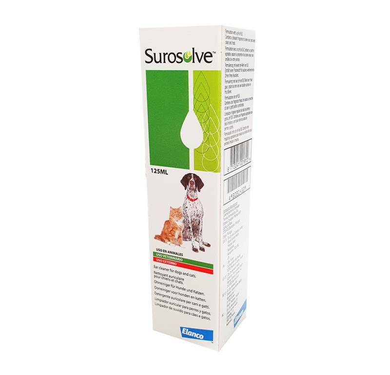 Surosolve™ est un nettoyant auriculaire haute performance pour chiens et chats, conçu pour assurer une hygiène parfaite tout en respectant la sensibilité du conduit auditif. Sa formule unique "Tris-EDTA + PCMX + acide salicylique" combine des actions antibactériennes, antiseptiques et purifiantes sans être irritante grâce à son pH neutre de 6,8. Présenté en flacon de 125 ml, il laisse un parfum frais très apprécié des propriétaires.