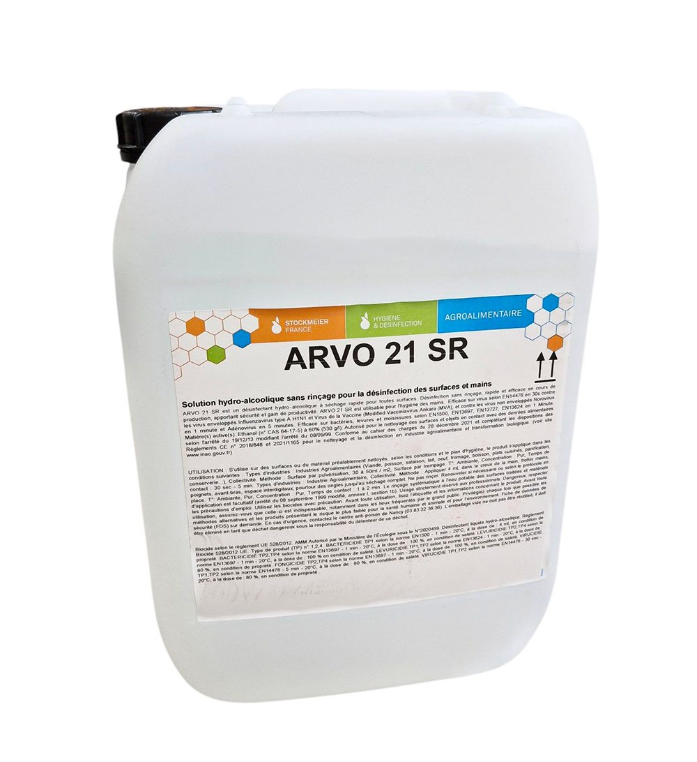 Dans les métiers de l'agroalimentaire et de la restauration, le temps et la sécurité sanitaire sont précieux. ARVO 21 SR est une solution professionnelle hydro-alcoolique conçue pour le nettoyage et la désinfection simultanée des surfaces, du petit matériel et même des mains.
