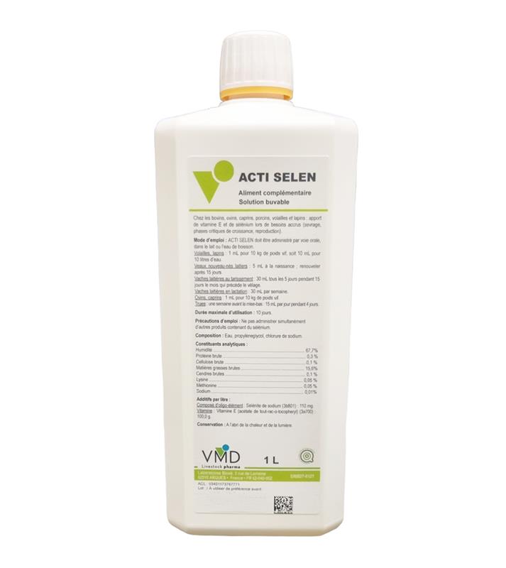 ACTI SELEN est un aliment complémentaire sous forme de solution buvable, riche en vitamine E et en sélénium. Ce format économique de 1 litre est spécifiquement conçu pour les besoins accrus des élevages de volailles, lapins, bovins, ovins, caprins et porcins lors de phases critiques telles que le sevrage, la croissance rapide ou la reproduction. Il participe activement à la protection des cellules contre les phénomènes d'oxydation.