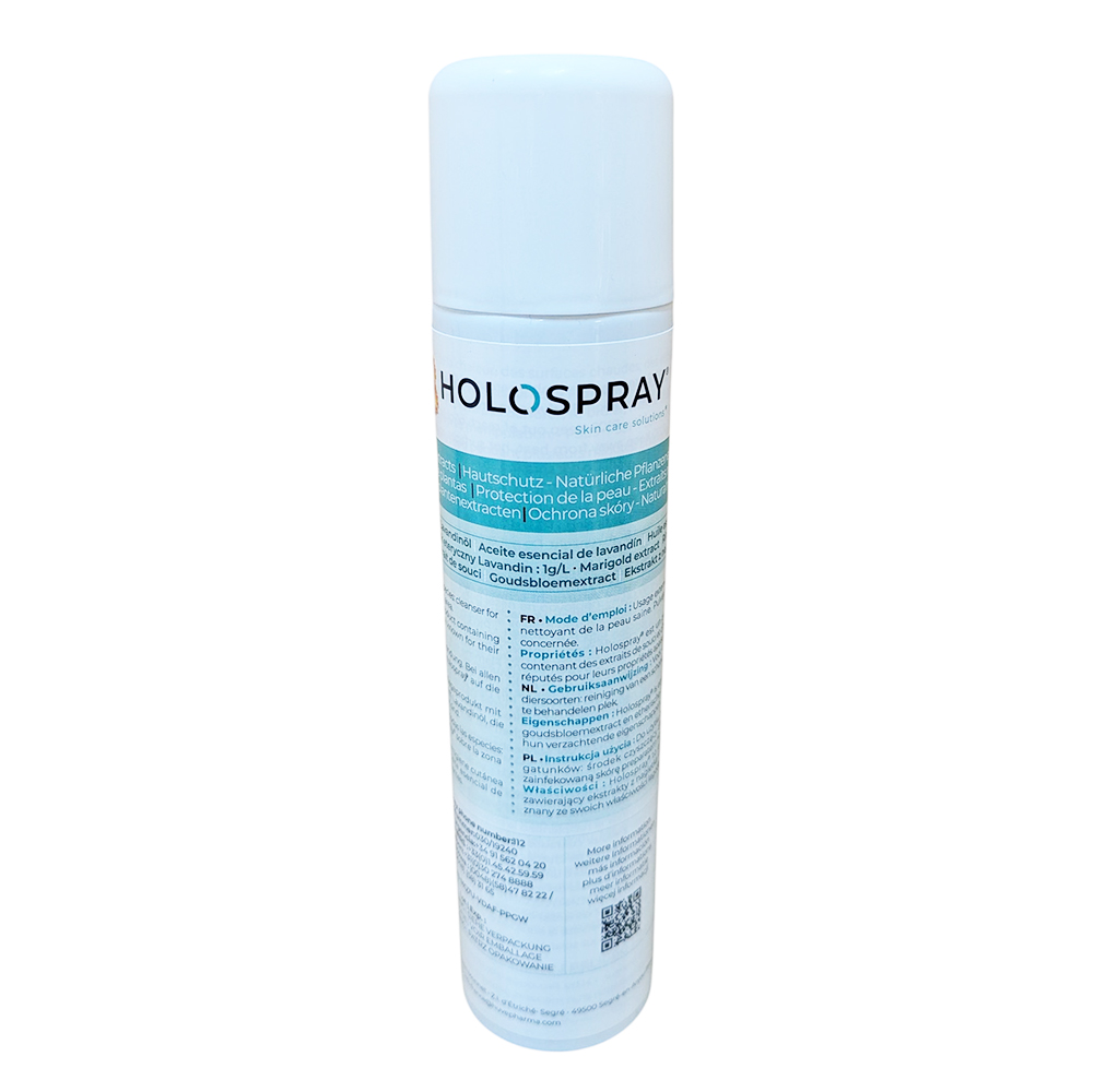 Holospray est un aérosol de soin cutané polyvalent conçu pour nettoyer, purifier et protéger la peau et les muqueuses de toutes les espèces animales, et ce dès la naissance. Sa formule unique à base d'huile de lavandin et d'extrait de souci (Calendula) favorise la régénération naturelle des tissus tout en créant une barrière protectrice. Son format pratique de 300 ml avec spray multi-positions assure une application homogène et précise.