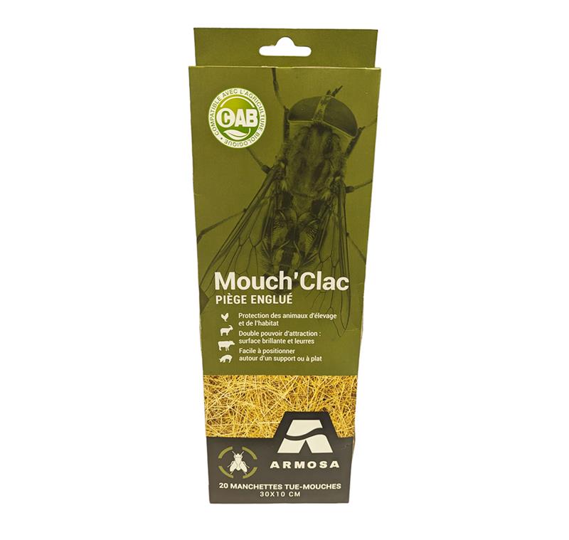 Les Manchettes Tue-Mouches Mouch'Clac (pack de 20) sont des pièges englués spécifiquement conçus pour la protection des animaux d'élevage et de leur habitat. Grâce à un double pouvoir d'attraction combinant leurres visuels et surface brillante, ces manchettes de 30x10 cm capturent massivement les mouches de manière écologique.