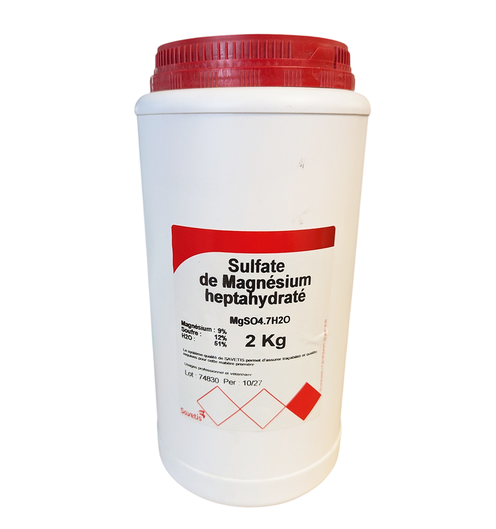 Le sulfate de magnésium est-il le même que le sel d'Epsom ? Oui, chimiquement, le sulfate de magnésium heptahydraté est connu sous le nom commun de sel d'Epsom. Toutefois, ce conditionnement Savetis est spécifiquement certifié et tracé pour un usage en alimentation animale.