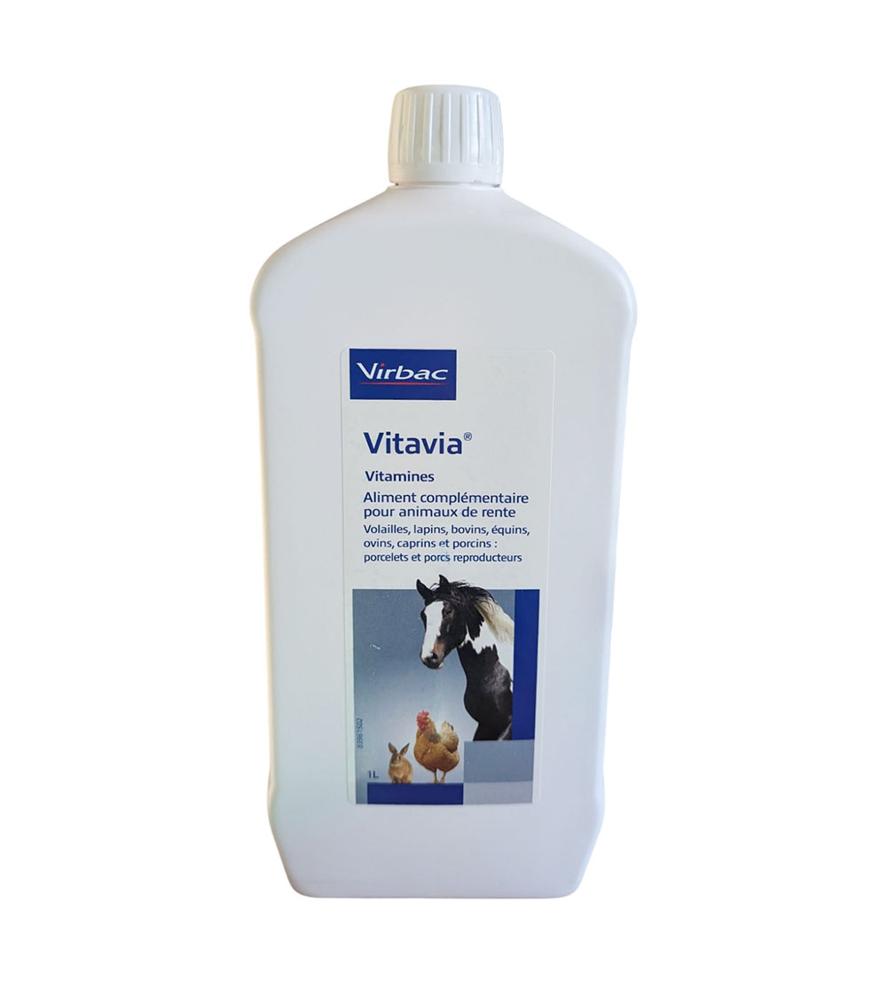 VITAVIA® des laboratoires Virbac est un aliment complémentaire polyvitaminé complet sous forme d'hydrosol, destiné aux animaux de rente (volailles, lapins, bovins, équins, ovins, caprins et porcins). Ce complexe apporte l'intégralité des vitamines essentielles pour soutenir l'organisme lors des phases critiques telles que la croissance, la ponte, la gestation ou la lactation. Sa formule haute sécurité ne dénature pas le goût de la viande ou des œufs, même en cas d'utilisation prolongée.
