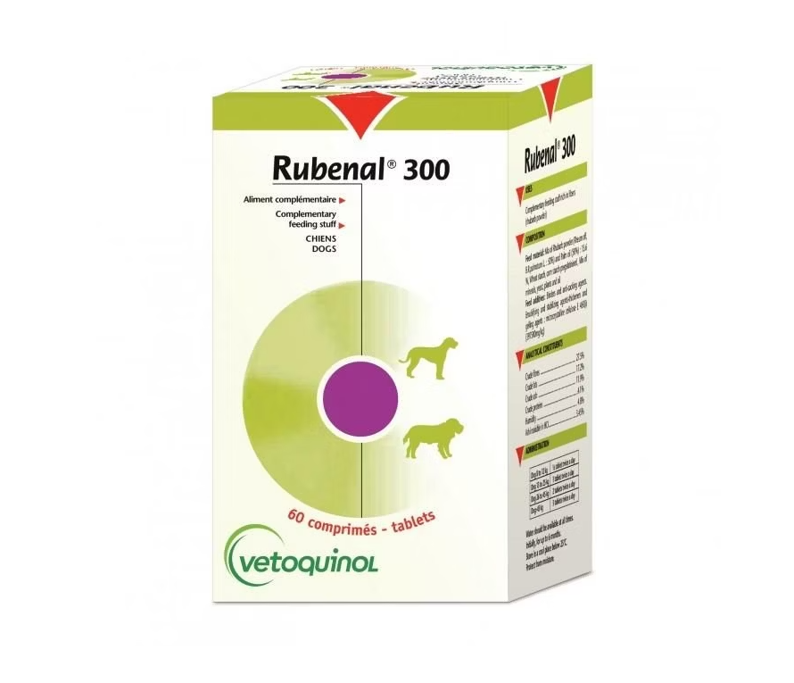 RUBENAL 300 est un complément alimentaire en comprimés destiné aux chiens souffrant de problèmes rénaux.