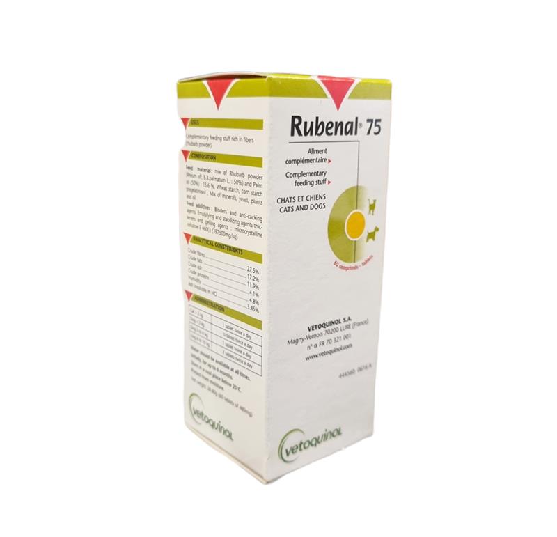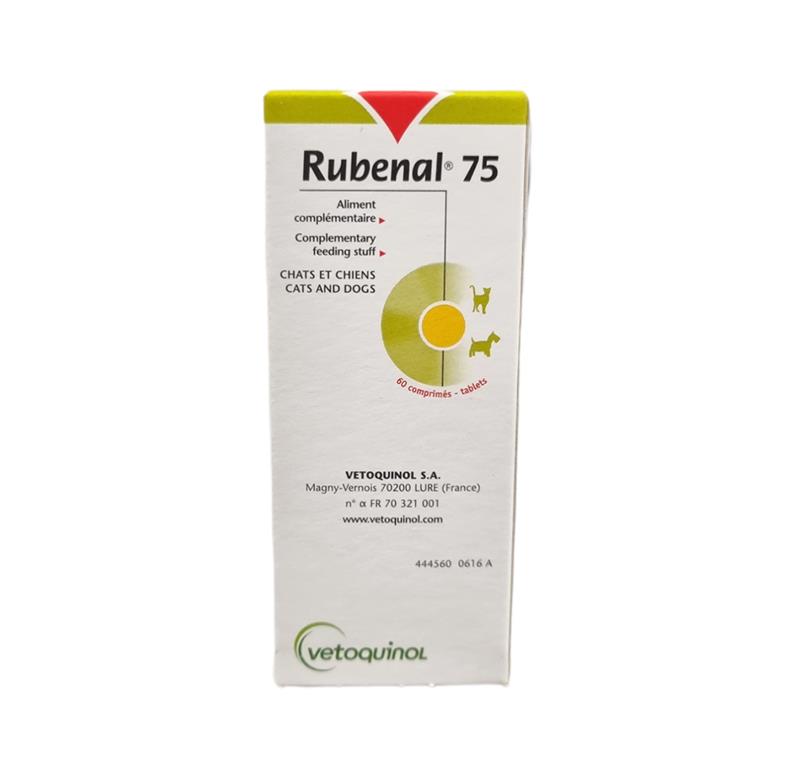 RUBENAL 75 est un complément alimentaire en comprimés destiné aux petits chiens et chats souffrant de problèmes rénaux.