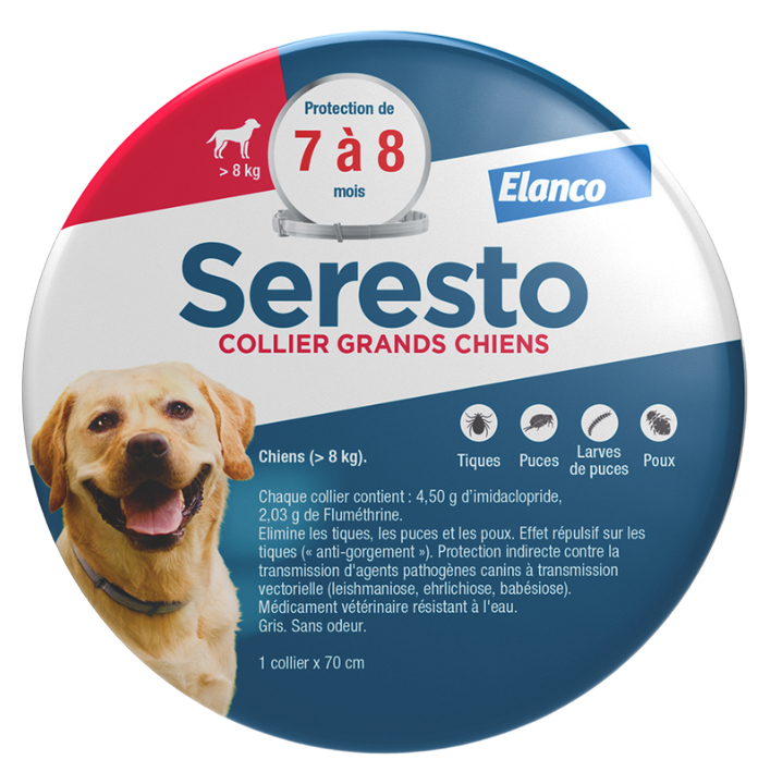 Puis-je l'utiliser sur un chien de moins de 8 kg ? Pour les chiens de moins de 8 kg, il est impératif d'utiliser la version Seresto Petits Chiens (38 cm), dont le dosage en principes actifs est adapté à leur poids.