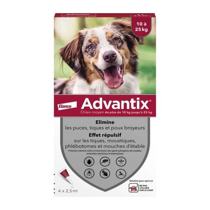 Advantix bénéficie en plus d'une action répulsive qui ne se contente pas de tuer les parasites, mais de les repousse également, évitant ainsi le risque de contact entre le parasite et votre chien. Cette action répulsive permet de limiter le risque de transmission de maladies à votre animal.
