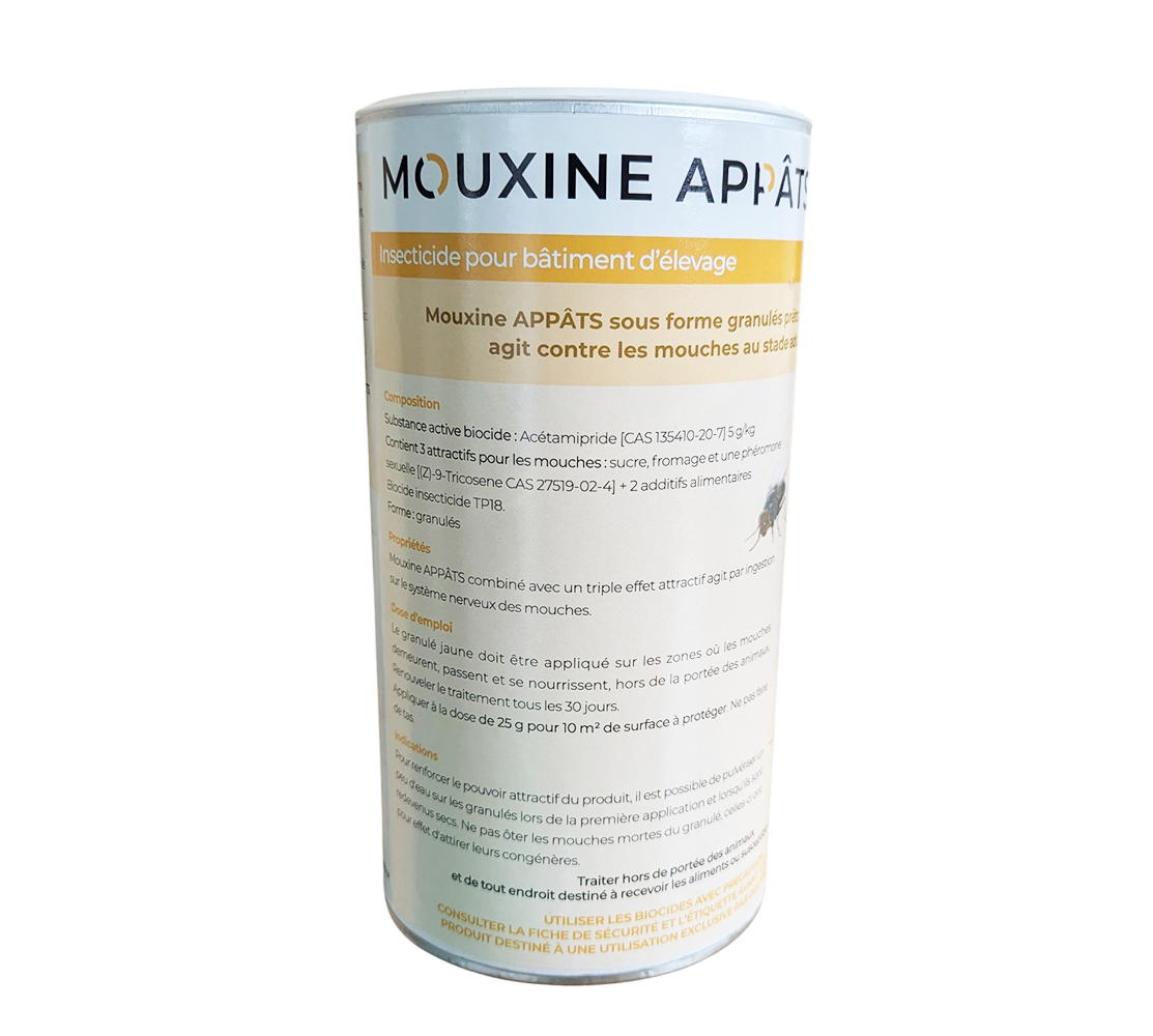 Mouxine® Appâts GB est un insecticide sous forme de granulés jaunes prêt à l'emploi, spécialement conçu pour le contrôle radical des mouches au stade adulte dans tous les types de bâtiments d'élevage. Formulé à base d'Acétamipride, ce granulé sans odeur offre une attractivité exceptionnelle grâce à une combinaison unique de phéromones sexuelles et d'additifs alimentaires.