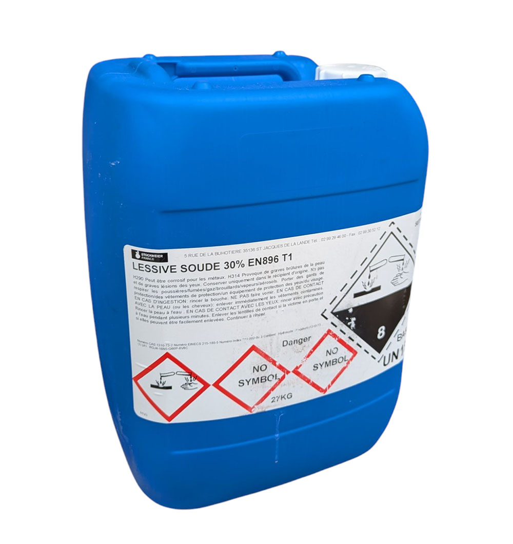 La Lessive de Soude 30 % est une solution d'hydroxyde de sodium liquide de haute pureté, spécifiquement homologuée pour la désinfection et le traitement de l'eau potable. Conforme à la norme EN 896 T1, ce produit est un agent essentiel pour l'ajustement du pH et la sécurisation sanitaire des réseaux d'eau destinée à la consommation humaine. Présentée en bidon de 27 kg (soit environ 20 litres), elle est adaptée aux exigences des exploitations agricoles et des collectivités.