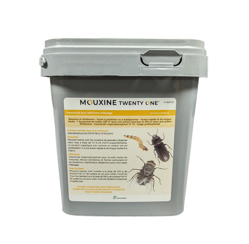 Mouxine Twenty One est un insecticide adulticide et larvicide puissant sous forme de poudre mouillable, spécifiquement formulé pour la lutte contre les mouches adultes et les ténébrions dans les bâtiments d'élevage. À base d'azaméthiphos (10%), il offre une action rapide et de longue durée, tout en étant utilisable en présence d'animaux. Ce format 1 kg permet de couvrir de larges surfaces selon le type de production (vaches, porcs, volailles, etc.)