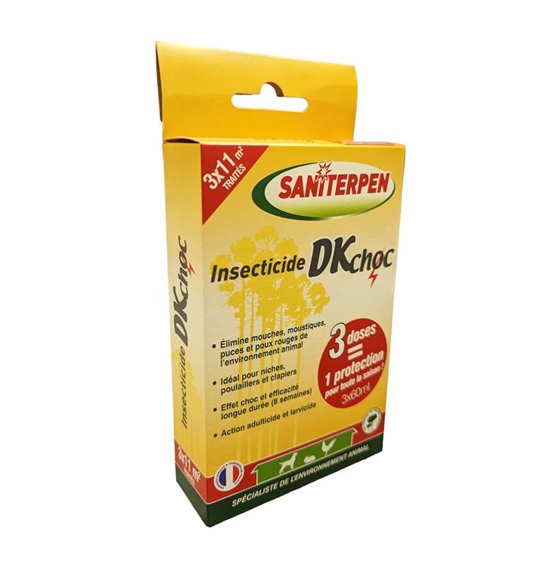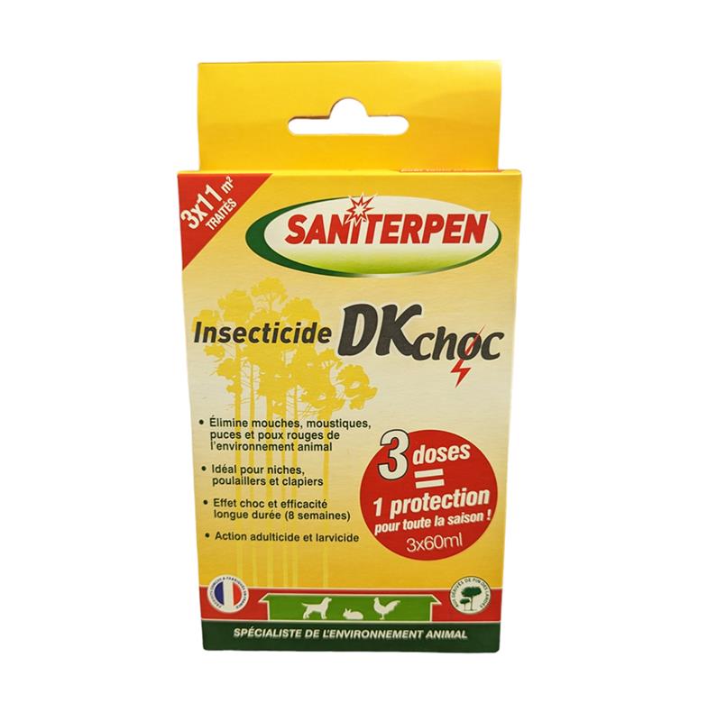 Saniterpen insecticide DK choc est un insecticide concentré il élimine les insectes volants et rampants (mouches, puces, poux, poux rouges ...) de l'habitat et de ses abords tout en protégeant les chiens, chats, chevaux, volailles, rongeurs, des nuisances occasionnées par certains parasites (allergies, transmission de maladies, démangeaisons...), idéal pour niches, poulaillers et clapiers.