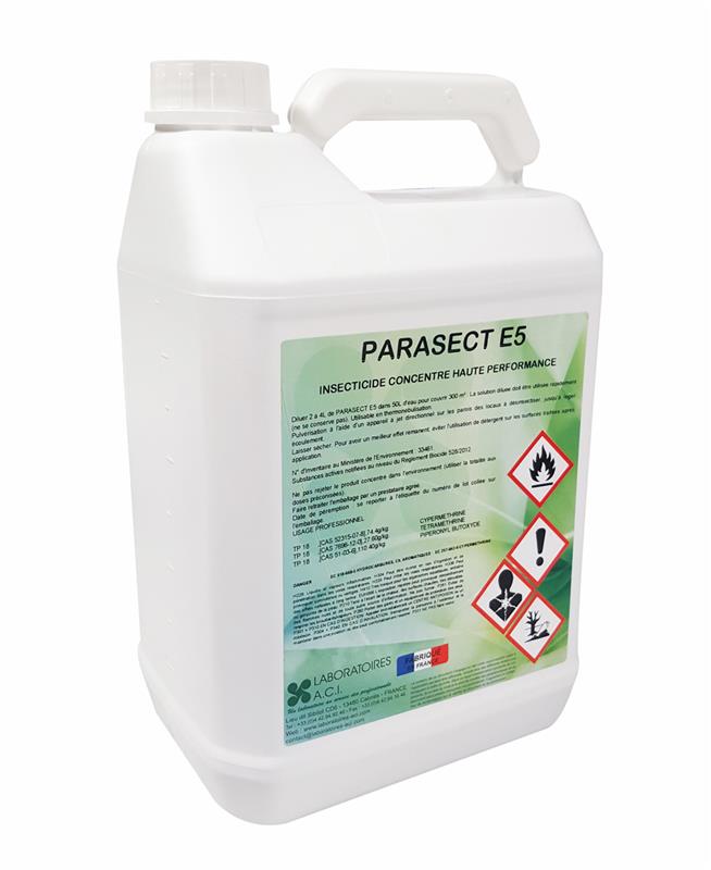 L'Insecticide PARASECT E5 en bidon de 5 Litres est un concentré haute performance destiné à la désinsectisation des volumes importants et des grandes surfaces professionnelles. Grâce à sa double action par contact et par ingestion, il offre un effet choc immédiat suivi d'une rémanence protectrice allant jusqu'à 3 semaines contre les insectes les plus résistants.