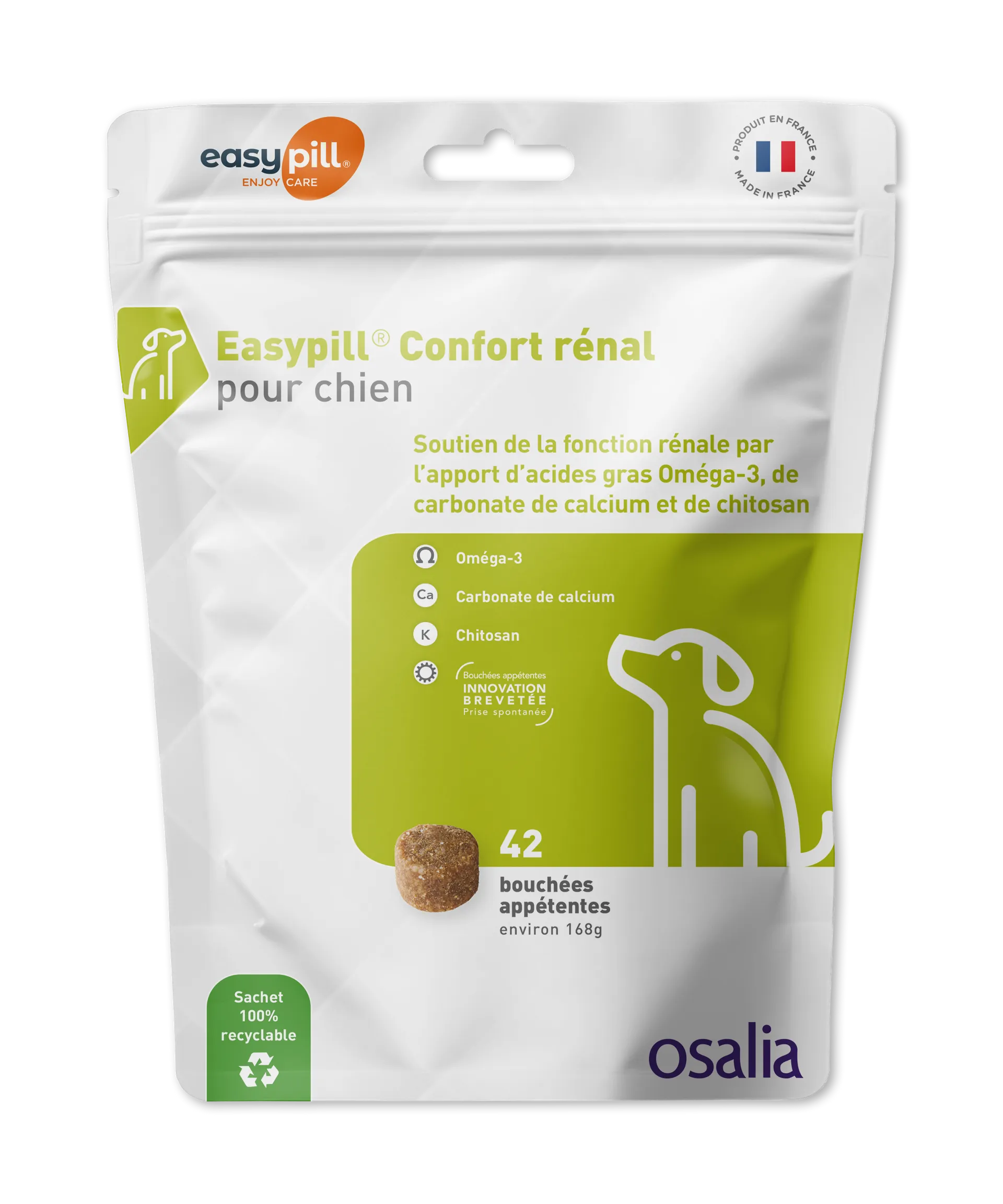 Easypill Confort Rénal est la solution nutritionnelle de référence pour accompagner les chiens souffrant d'insuffisance rénale chronique. Sa formule complète aide à limiter l'absorption du phosphore alimentaire et à protéger les reins des toxines. Présenté sous forme de bouchées tendres et très appétentes, il facilite la prise quotidienne du traitement, même chez les animaux ayant peu d'appétit.