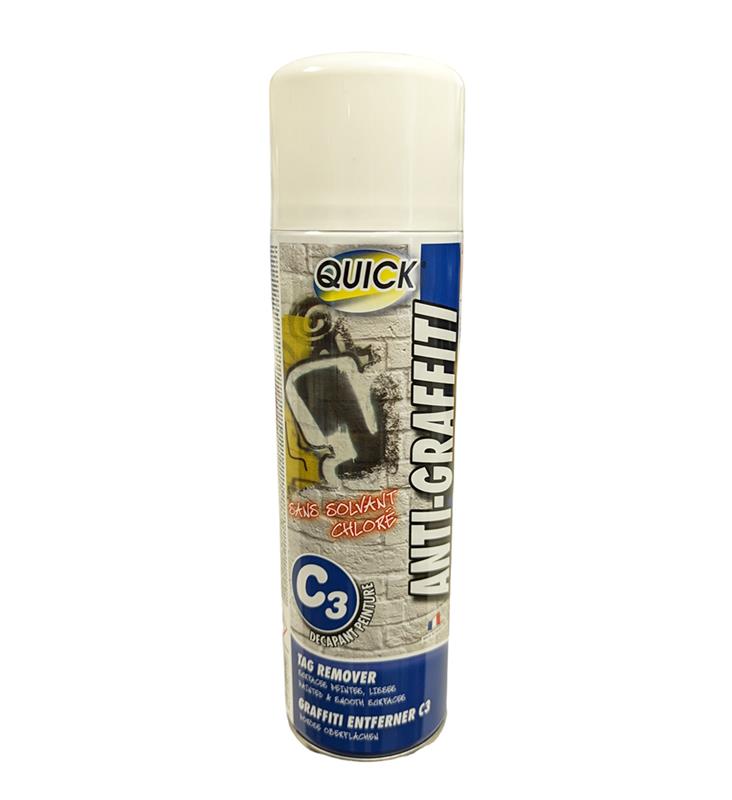 Aérosol anti graffiti C3 (sans solvant chloré) permettant de traiter 8m², efface tous les graffitis sur les surfaces poreuses (grès, marbre, brique...).