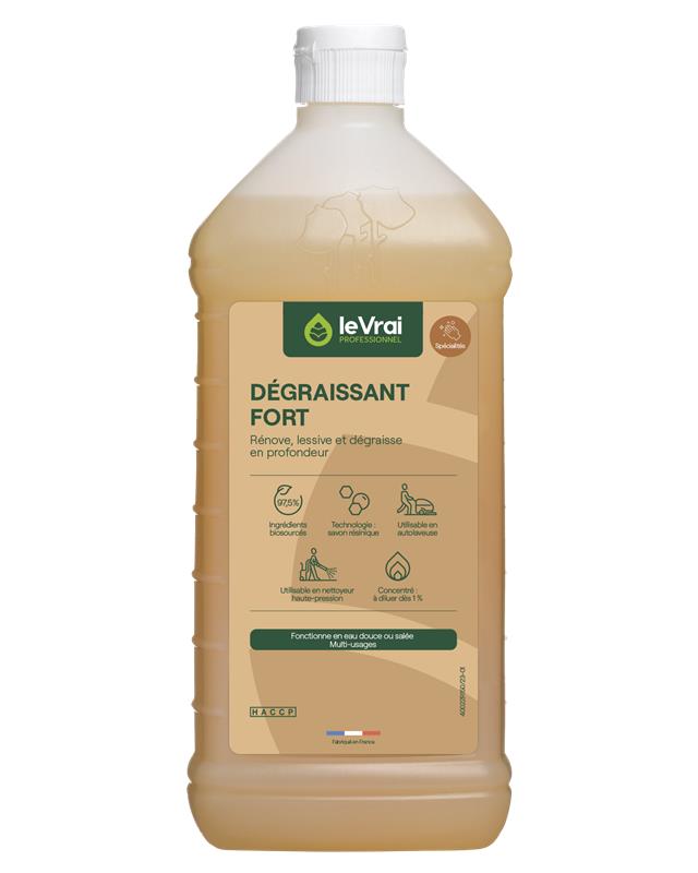 Le Vrai professionnel dégraissant fort est particulièrement adapté aux secteurs alimentaires, industriels, collectifs et sportifs. Sa formule très concentrée est soluble en eau chaude ou froide et également en eau de mer.