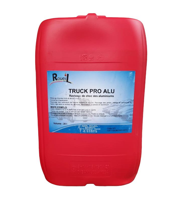 Le TRUCK PROALU est un nettoyant rénovateur acide ultra-puissant conditionné en bidon de 20 Litres. Spécialement formulé pour l'aluminium, il agit comme un "ravivage de choc" pour désincruster les jantes de camions et voitures ainsi que les citernes routières. C'est un produit détartrant et "décrochant" de qualité professionnelle, utilisable en milieu alimentaire (extérieur de cuves).