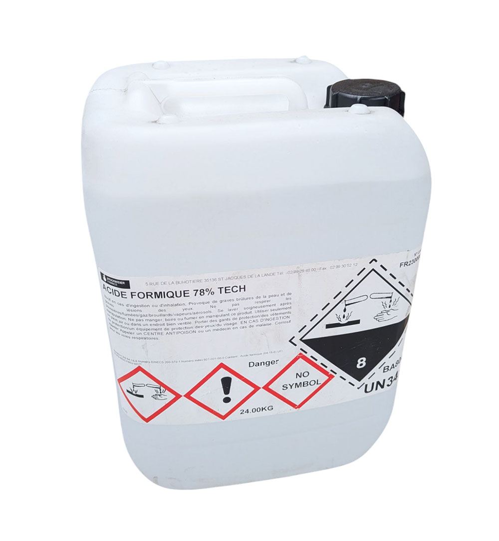 L'acide formique (ou acide méthanoïque) est l'acide organique le plus simple et l'un des plus efficaces. Avec une concentration élevée de 78%, ce produit de qualité technique offre un excellent rapport coût/efficacité pour les professionnels.