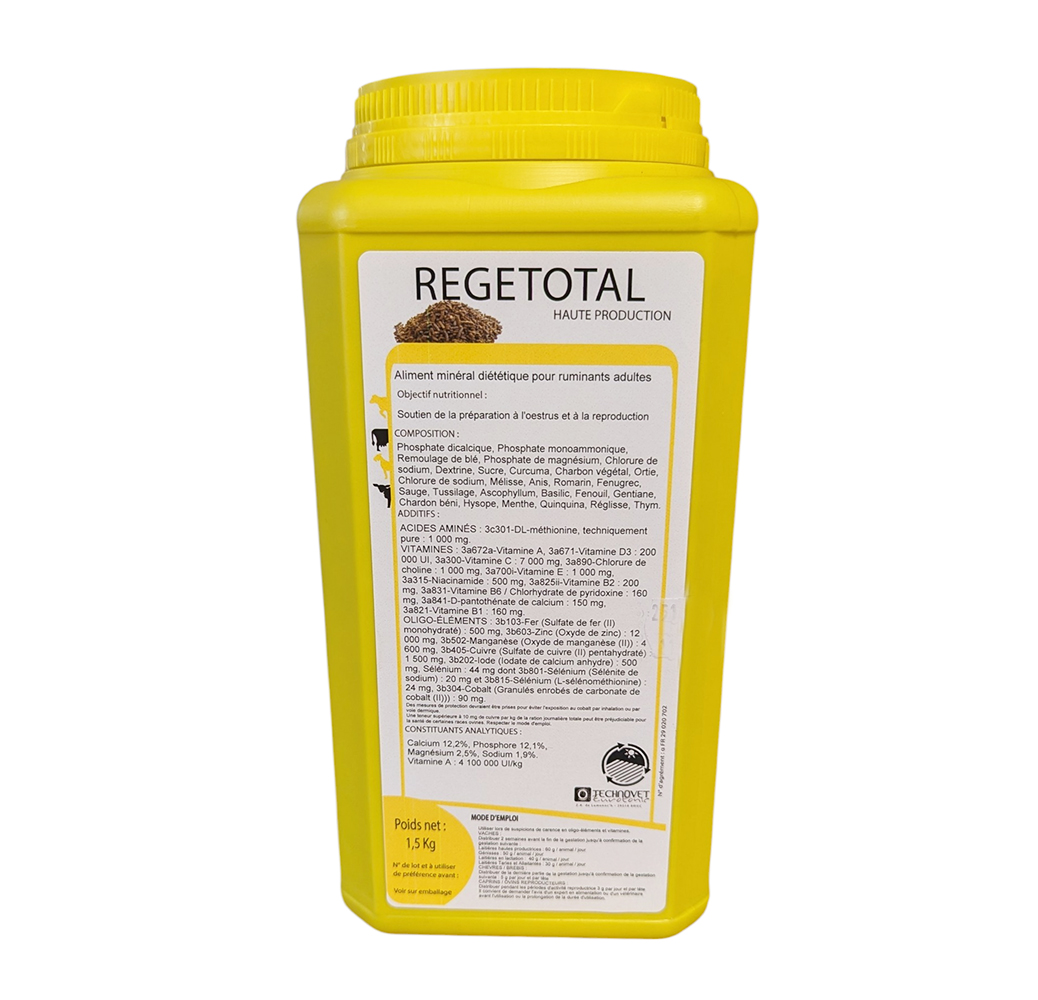 REGETOTAL est un aliment minéral polyvalent présenté sous forme de granulés, spécialement formulé pour les ruminants (bovins, ovins, caprins) et les porcins. Conditionné en pot de 1,5 kg, ce complément nutritionnel complet apporte les minéraux, vitamines, acides aminés et oligo-éléments indispensables pour soutenir la croissance, la production laitière et la vitalité générale de l'animal.