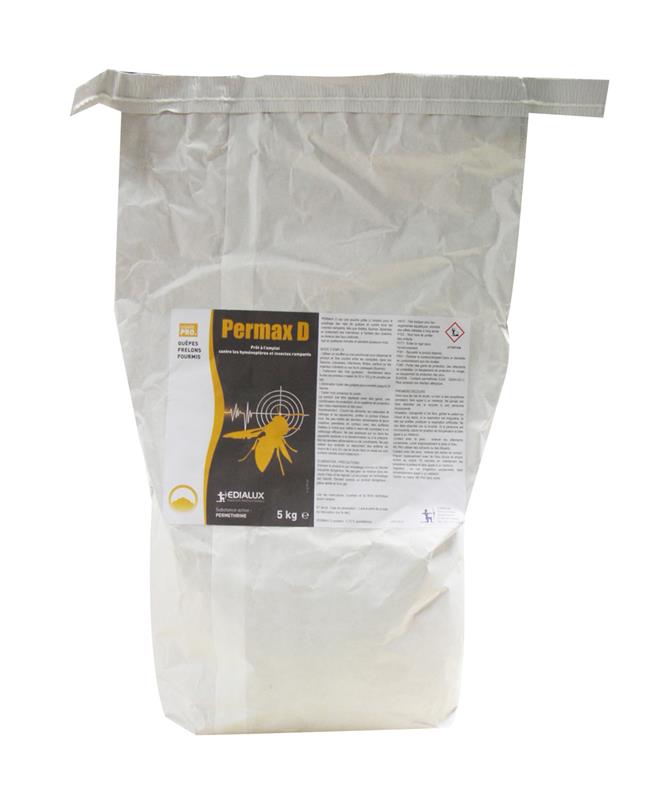 Le Permax D (Sac de 5 kg) est une solution insecticide professionnelle prête à l'emploi, formulée pour le traitement à grande échelle des hyménoptères et des insectes rampants. Ce format économique permet de traiter de nombreux nids de guêpes ou de grandes surfaces infestées par les fourmis avec une efficacité foudroyante par contact.