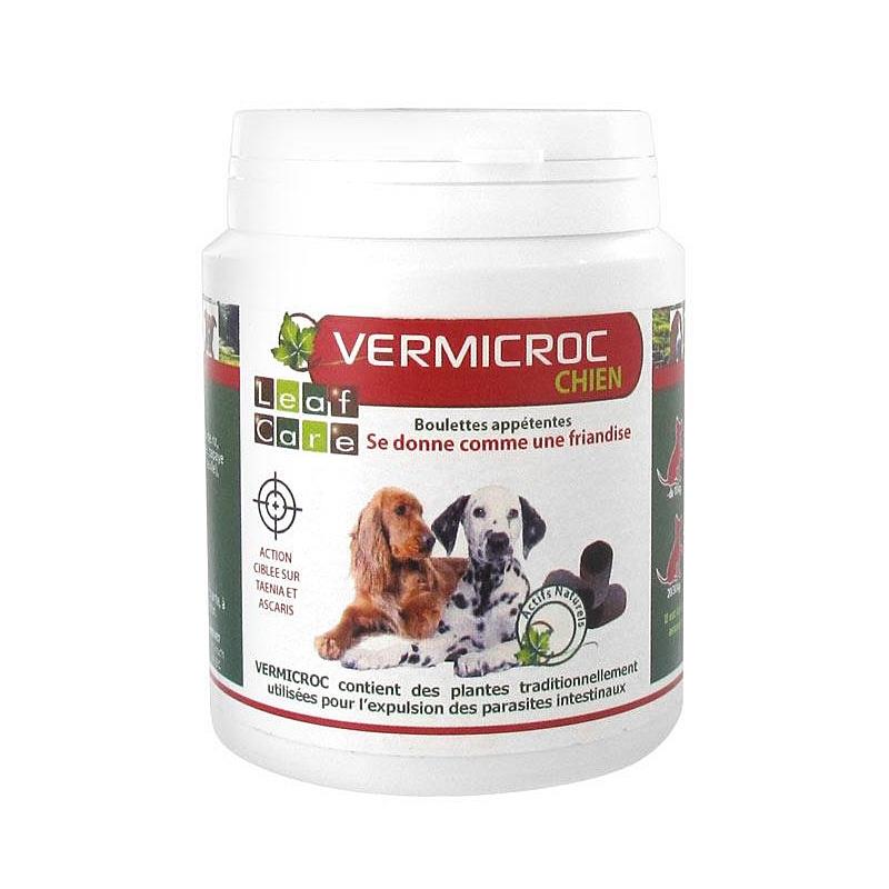 Vermicroc Chien est un aliment complémentaire sous forme de boulettes appétentes élaboré par Leaf Care pour soutenir l'hygiène digestive canine. Formulé à base de plantes traditionnellement reconnues pour favoriser l'expulsion des parasites intestinaux, ce soin possède une action ciblée sur les vers de type Taenia et Ascaris. Grâce à sa texture savoureuse, il se donne comme une friandise, transformant l'administration en un véritable moment de plaisir.