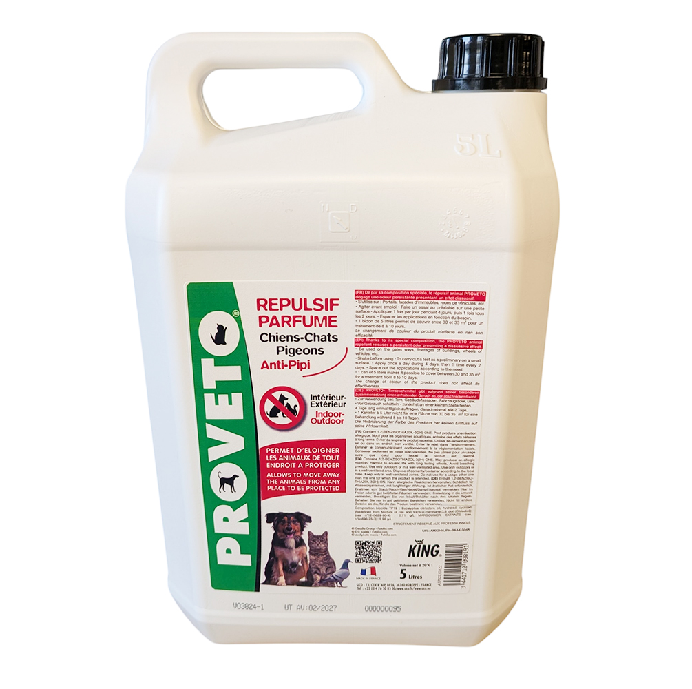 Le Répulsif Parfumé PROVETO KING en bidon de 5 litres est un produit dissuasif conçu pour éloigner efficacement les animaux des zones à protéger. Grâce à son odeur spécifique, il empêche les chiens, chats et pigeons de souiller vos surfaces, que ce soit à l'intérieur ou à l'extérieur.