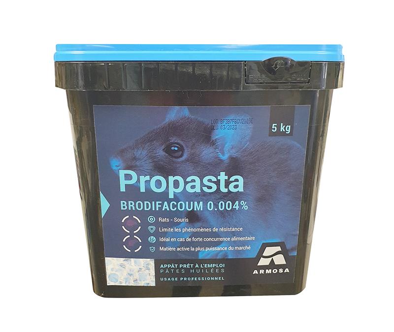 Propasta est un appât rodenticide professionnel prêt à l'emploi sous forme de pâtes huilées, formulé avec du brodifacoum à 0,004%. Spécialement conçu pour un traitement curatif à l'intérieur des bâtiments, ce produit offre un effet choc radical contre les rats et les souris. Grâce à sa matière active, la plus puissante du marché, il permet de surmonter les phénomènes de résistance les plus sévères.