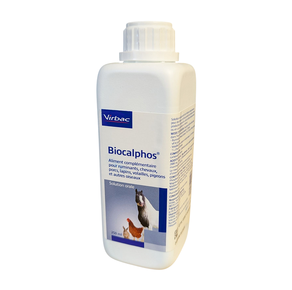Biocalphos (250 ml) est une solution orale de minéraux et d'oligo-éléments haute performance conçue par Virbac. Ce complément alimentaire est spécialement formulé pour apporter un soutien nutritionnel lors des phases critiques de production (gestation, lactation, ponte) ou pour corriger rapidement les carences minérales chez de nombreuses espèces d'élevage et d'agrément.