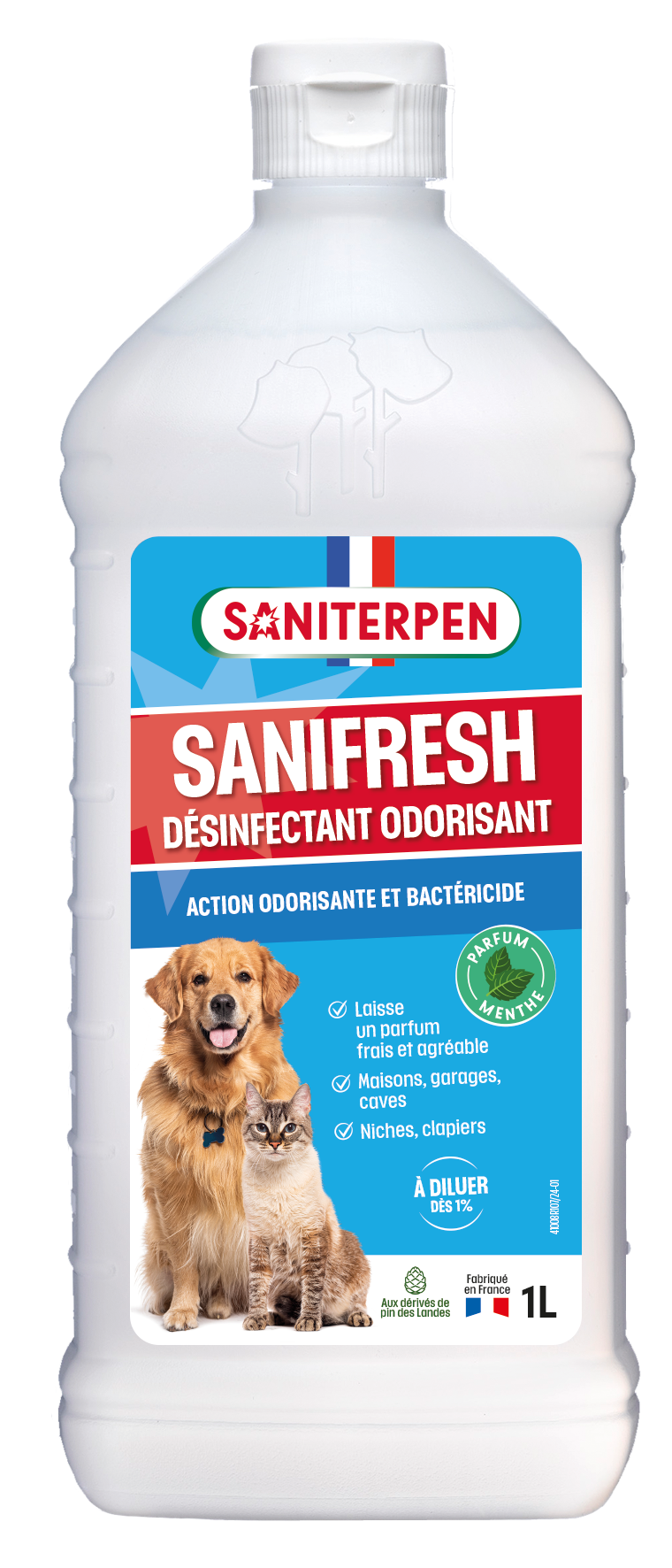 Désinfectant, bactéricide et odorisant, s'utilise sur les sols et surfaces des lieux de vie des animaux, mais aussi des caves, garages, terrasses, sous-sols...