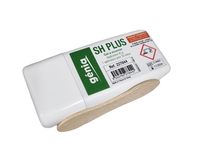 La pâte à écorner SH PLUS est un gel caustique développé par le laboratoire GENIA pour l'écornage chimique des jeunes bovins. Sa formulation permet une application précise et simplifiée : une seule goutte déposée sur le cornillon suffit pour stopper la croissance de la corne. Ce flacon applicateur de 45 g est conçu pour traiter environ 30 veaux.