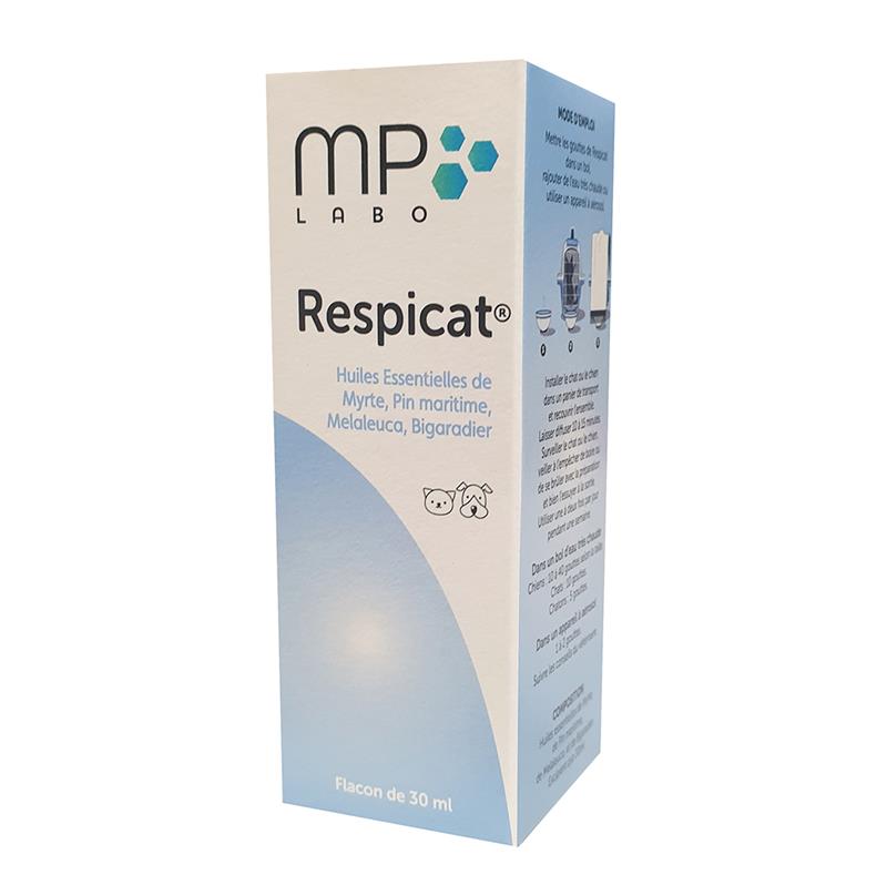 Respicat® est une solution naturelle formulée par MP Labo à base d'huiles essentielles sélectionnées pour aider à dégager les voies respiratoires des chiens et des chats. Utilisé en inhalation humide ou en aérosol, ce complexe de Myrte, Pin maritime, Mélaleuca et Bigaradier favorise le confort respiratoire lors d'épisodes d'encombrement. Présenté en flacon compte-gouttes de 30 ml, il permet une utilisation précise et adaptée aux besoins de l'animal.