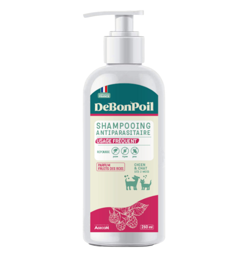 Associez hygiène, plaisir et protection avec le Shampooing Antiparasitaire Usage Fréquent de DeBonPoil. Sa formule douce au parfum gourmand de Fruits des Bois est conçue pour les lavages réguliers des chiens et chats (dès 2 mois). Fabriqué en France, il aide à repousser les puces, tiques et poux tout en laissant un pelage délicieusement parfumé.