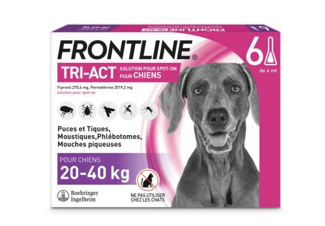 Quelle est la différence avec Frontline Combo ? Le Combo cible les puces et l'habitat (œufs/larves). Le Tri-Act cible les puces, les tiques ET les insectes volants (moustiques/phlébotomes). C'est le choix à privilégier pour les chiens d'extérieur exposés aux piqûres.