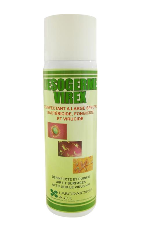 Le Desogerme VIREX est un aérosol de 500 ml polyvalent pour la désinfection de l'air et des surfaces. Bactéricide, fongicide et virucide (efficace sur H1N1 et HIV), il assure une hygiène parfaite dans les crèches, salles d'attente et véhicules. Sa formule à évaporation rapide ne laisse aucune trace et est compatible avec le contact alimentaire, tout en laissant un parfum agréable qui désodorise l'atmosphère.