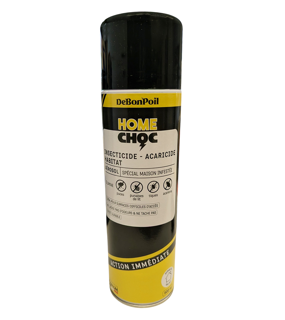 L'Home Choc Aérosol 100 m² est un spray acaricide, insecticide et larvicide de 500 ml conçu pour l'assainissement ciblé de l'habitat. Contrairement aux foggers automatiques, ce format spray permet une application précise sur les zones stratégiques et difficiles d'accès comme les plinthes, les dessous de meubles ou les accessoires des animaux domestiques.