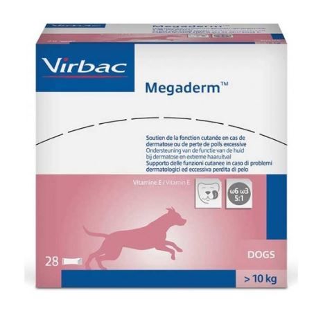 Megaderm™ est un supplément nutritionnel hautement appétent spécifiquement formulé pour les chiens de plus de 10 kg. Développé par les Laboratoires Virbac, ce complexe d'acides gras essentiels (AGE) et de vitamines soutient la fonction cutanée lors de dermatoses, d'allergies ou de perte excessive de poils.